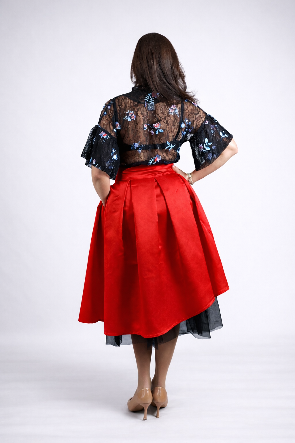 Back view of true red asymmetric satin skirt with soft black tulle underlayer designer skirt BIBI SAKALIEVA