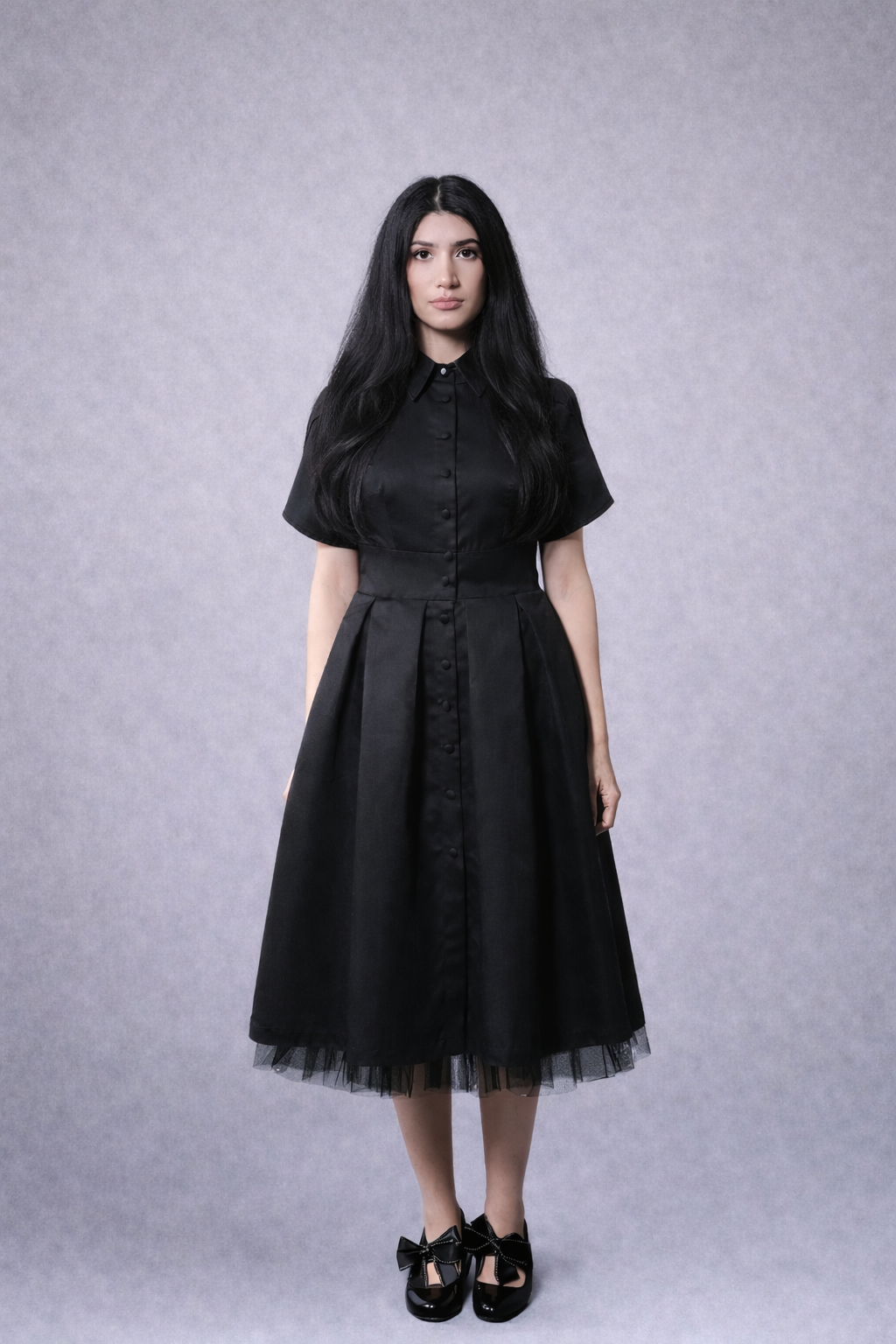 This black midi dress with removable tulle skirt is a timeless design that blends femininity, elegance and modern versatility. Designed to adapt to different occasions and styling moods, the dress is crafted for women who value individuality, quality and thoughtful design.