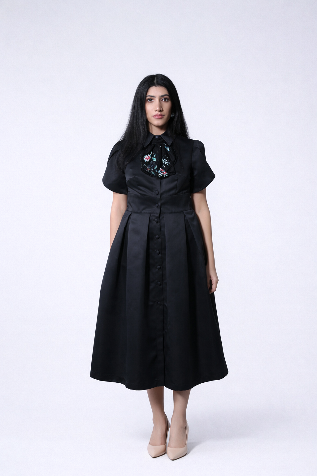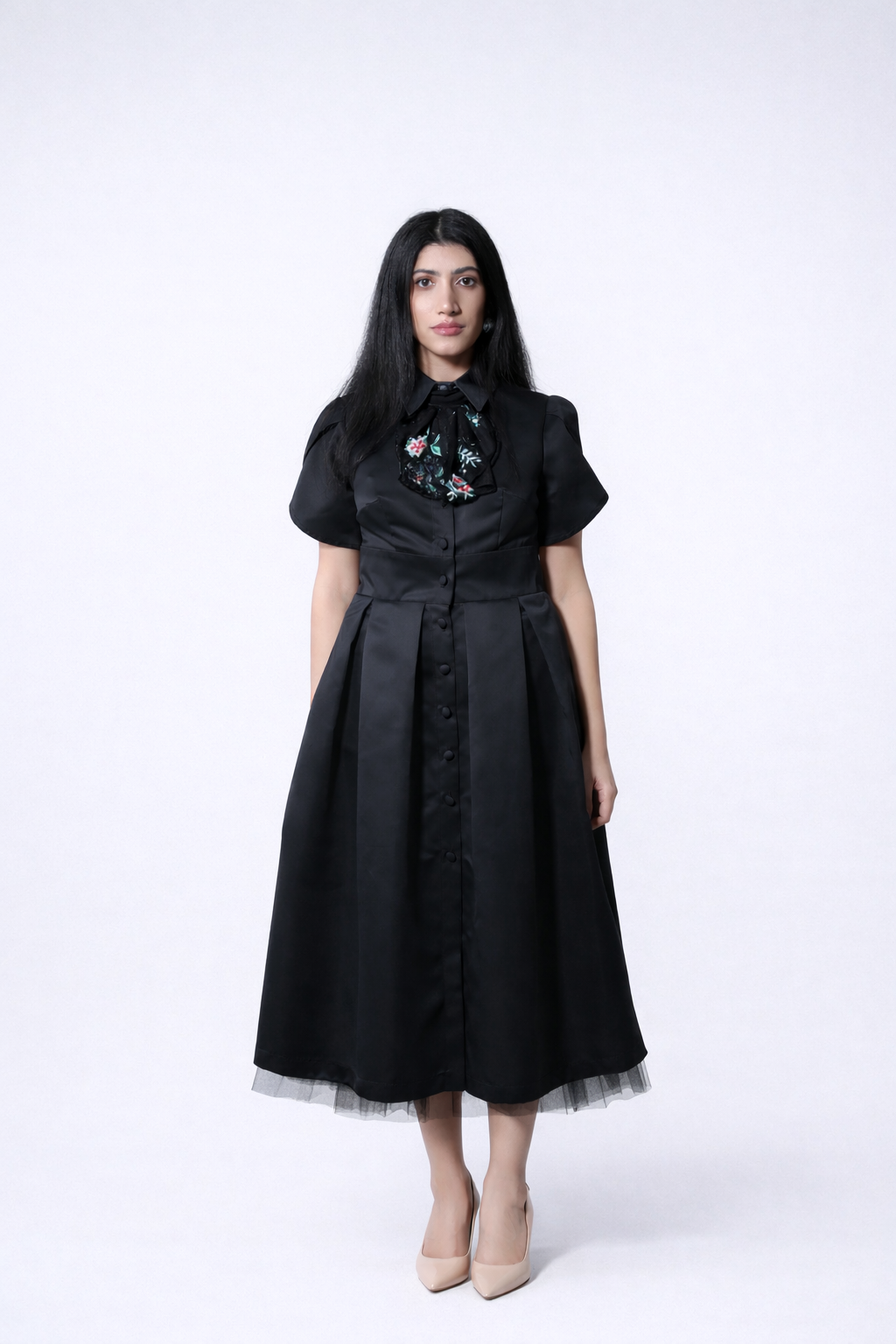 Elegant black midi dress with removable tulle skirt, featuring an open back, tulip sleeves and a detachable floral fichu. Designed with a defined waist, hidden pockets and versatile styling options.