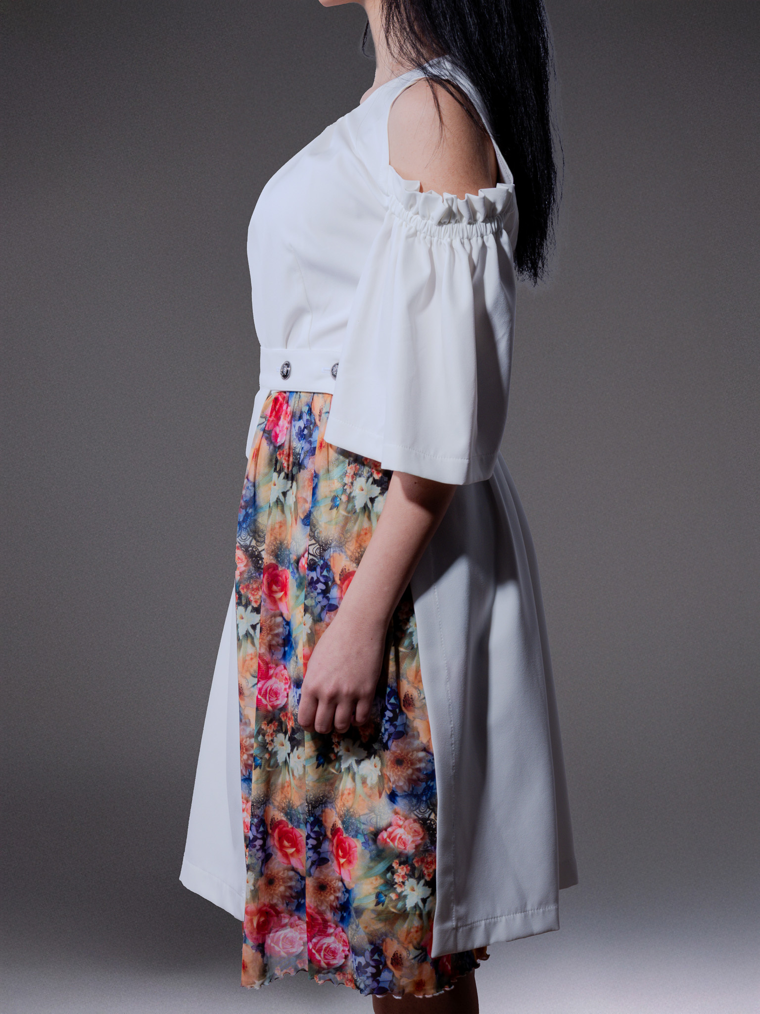 Elegant white dress with ruffled sleeves and removable floral kilt skirt